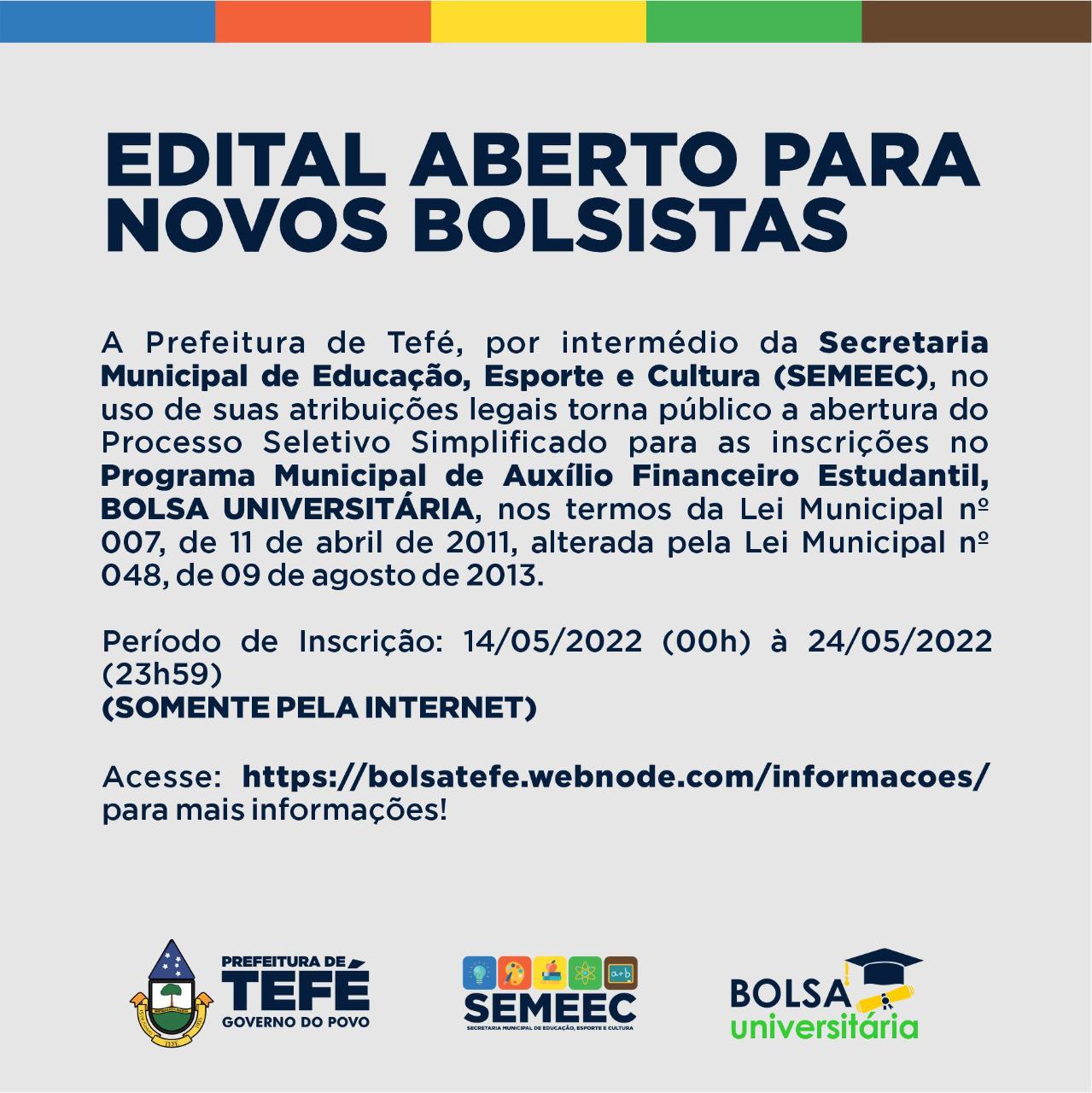A Prefeitura de Tefé, por intermédio da Secretaria Municipal de Educação, Esporte e Cultura (SEMEEC), no uso de suas atribuições legais torna público a abertura do Processo Seletivo Simplificado para as inscrições no Programa Municipal de Auxílio Financeiro Estudantil, BOLSA UNIVERSITÁRIA, nos termos da Lei Municipal nº 007, de 11 de abril de 2011, alterada pela Lei Municipal nº 048, de 09 de agosto de 2013.