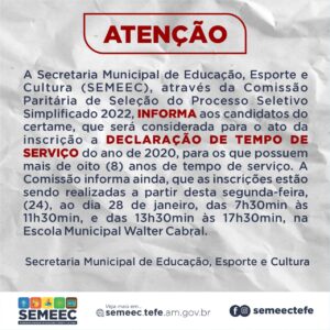 Será considerada para o ato da inscrição a DECLARAÇÃO DE TEMPO DE SERVIÇO do ano de 2020