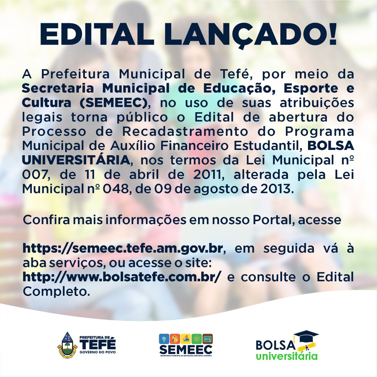 A Prefeitura Municipal de Tefé, por meio da Secretaria Municipal de Educação, Esporte e Cultura (SEMEEC), no uso de suas atribuições legais torna público o Edital de abertura do Processo de Recadastramento do Programa Municipal de Auxílio Financeiro Estudantil, BOLSA UNIVERSITÁRIA, nos termos da Lei Municipal nº 007, de 11 de abril de 2011, alterada pela Lei Municipal nº 048, de 09 de agosto de 2013.